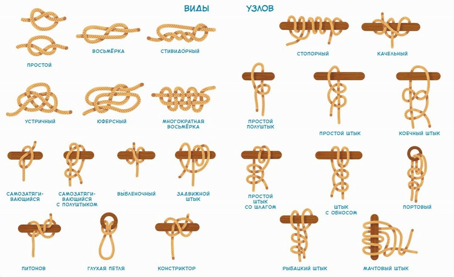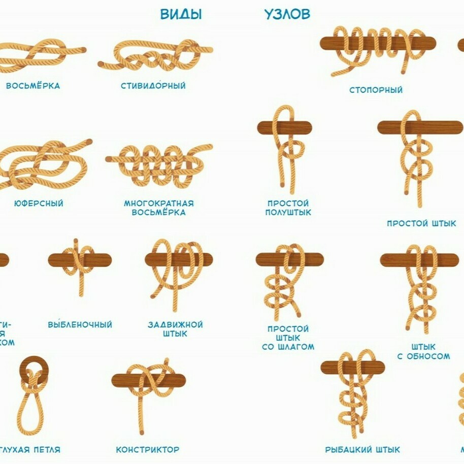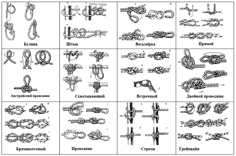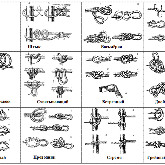 Видеопособие по умению вязать базовые узлы:1- восьмёрка, 2- грепвайн, 3- австрийский проводник, 4 - двойной проводник, 5- булинь, 6- брамшкотовый.